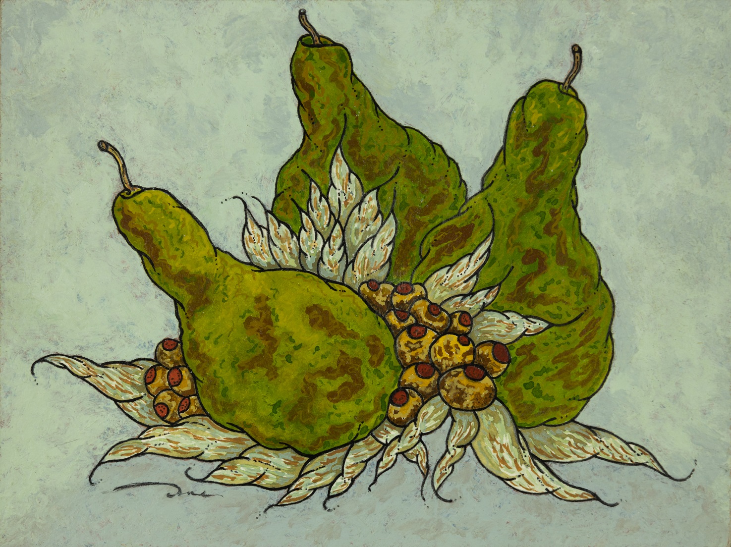 “One of a series, I fell in love with this piece. After I finished painting it, I hated the background. So, I slept on it. With the risk of ruining the piece, I mixed acrylic and cold wax together. In a painstaking process, I dabbed the sticky mess onto the painting.”Gene Stout